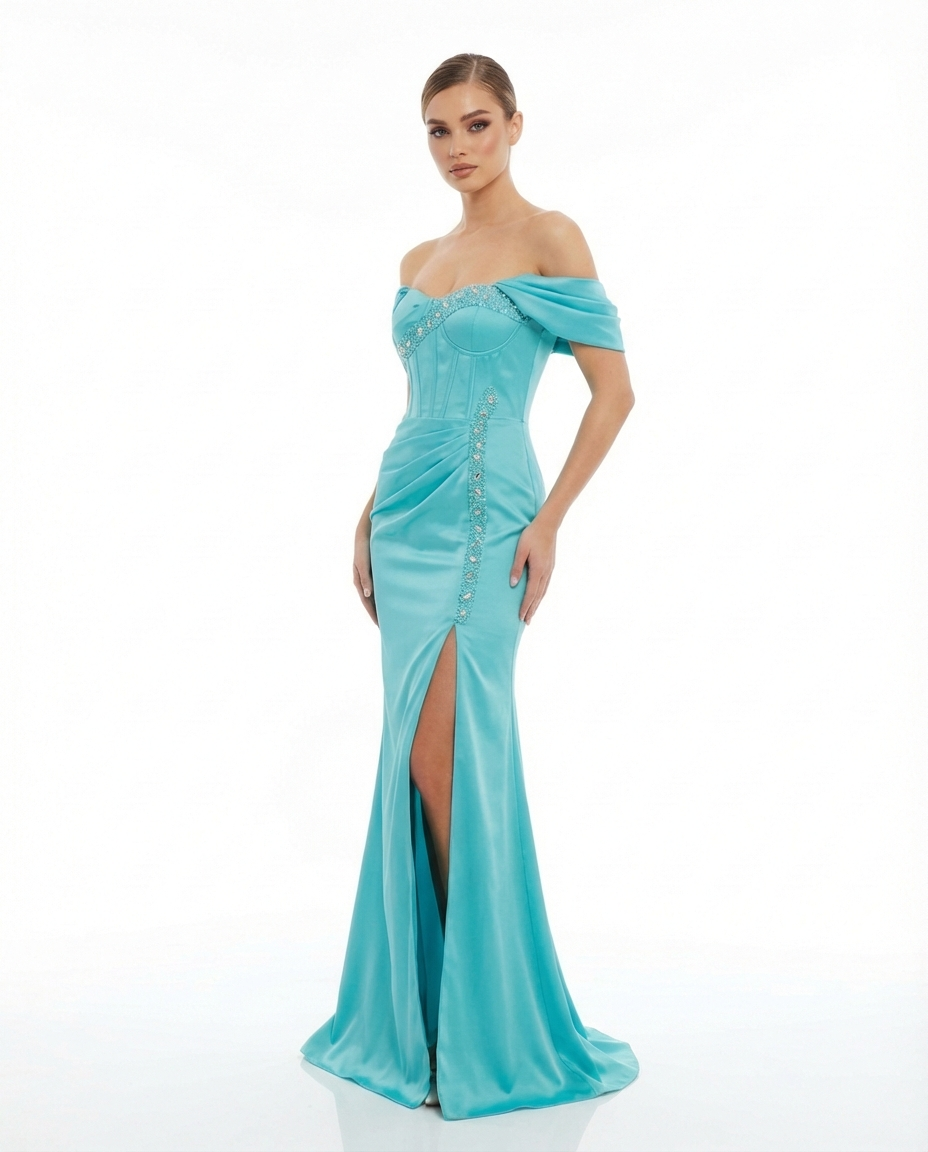 Dieses Abendkleid überzeugt mit einer ausdrucksstarken, femininen Silhouette und einer edlen, modernen Ausstrahlung. Das schulterfreie Design mit weich fallenden Ärmeln und die funkelnden Verzierungen setzen das Oberteil besonders stilvoll in Szene.