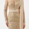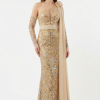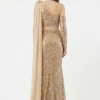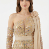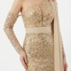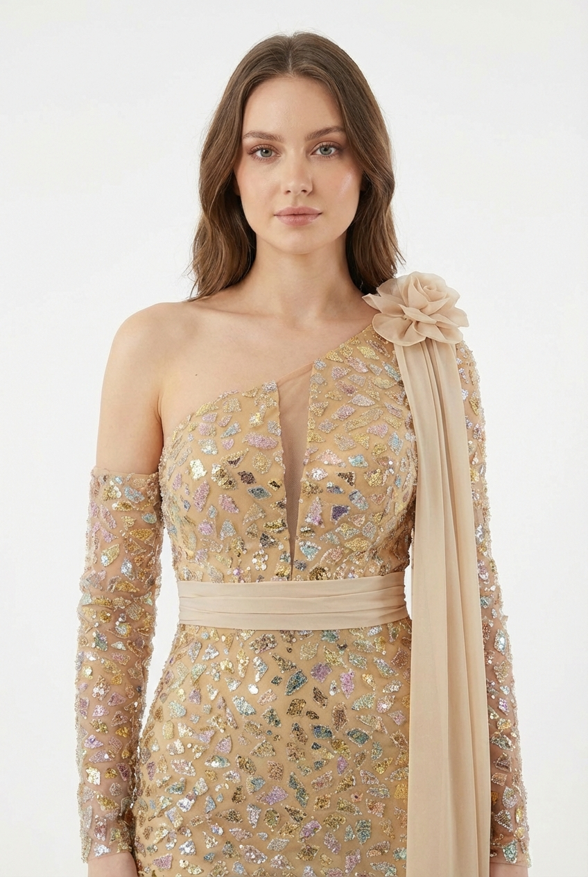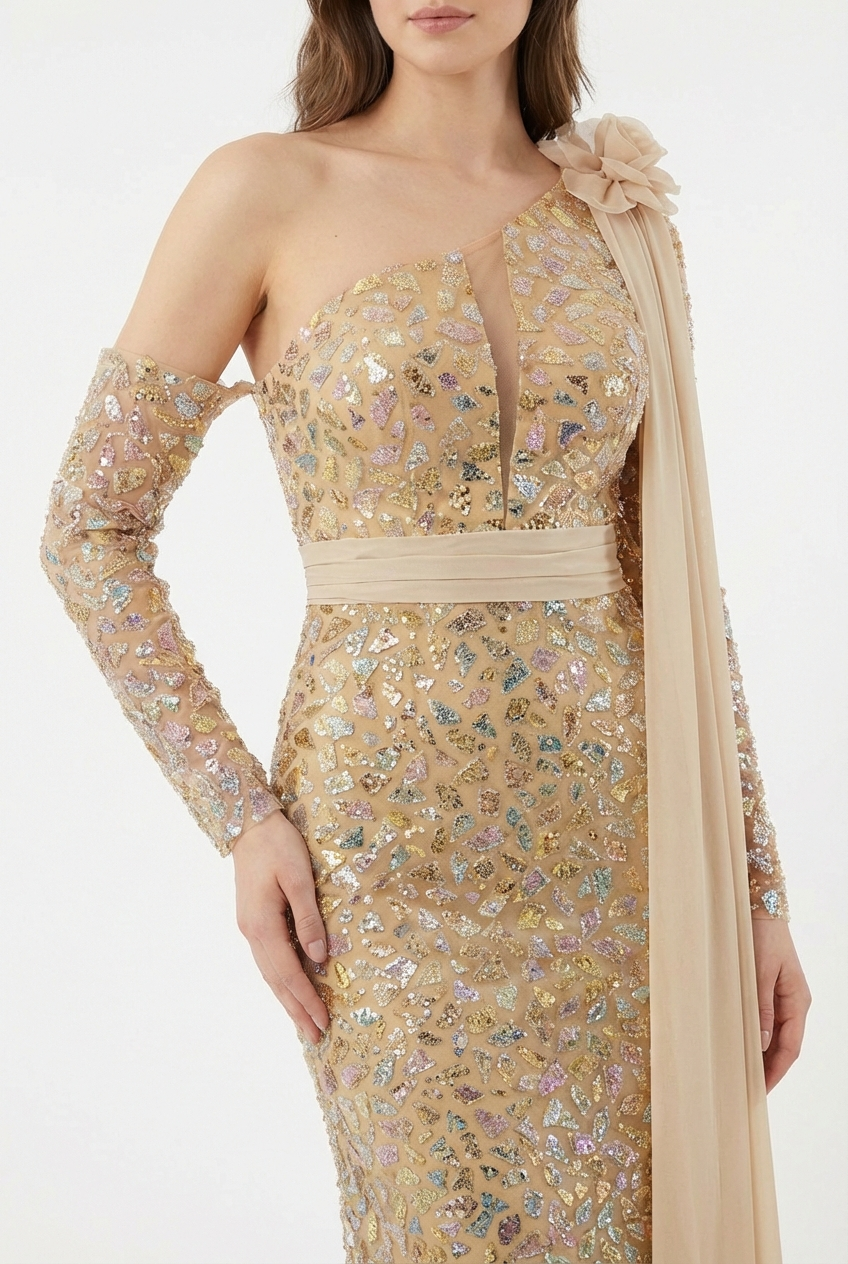 Dieses Haute Couture Abendkleid fasziniert mit einer außergewöhnlich eleganten und ausdrucksstarken Ausstrahlung. Das asymmetrische Design mit funkelnder Allover Verzierung, schmaler Silhouette und fließendem Schulterdetail verleiht dem Look eine luxuriöse, moderne Wirkung.