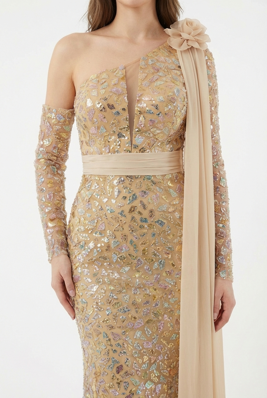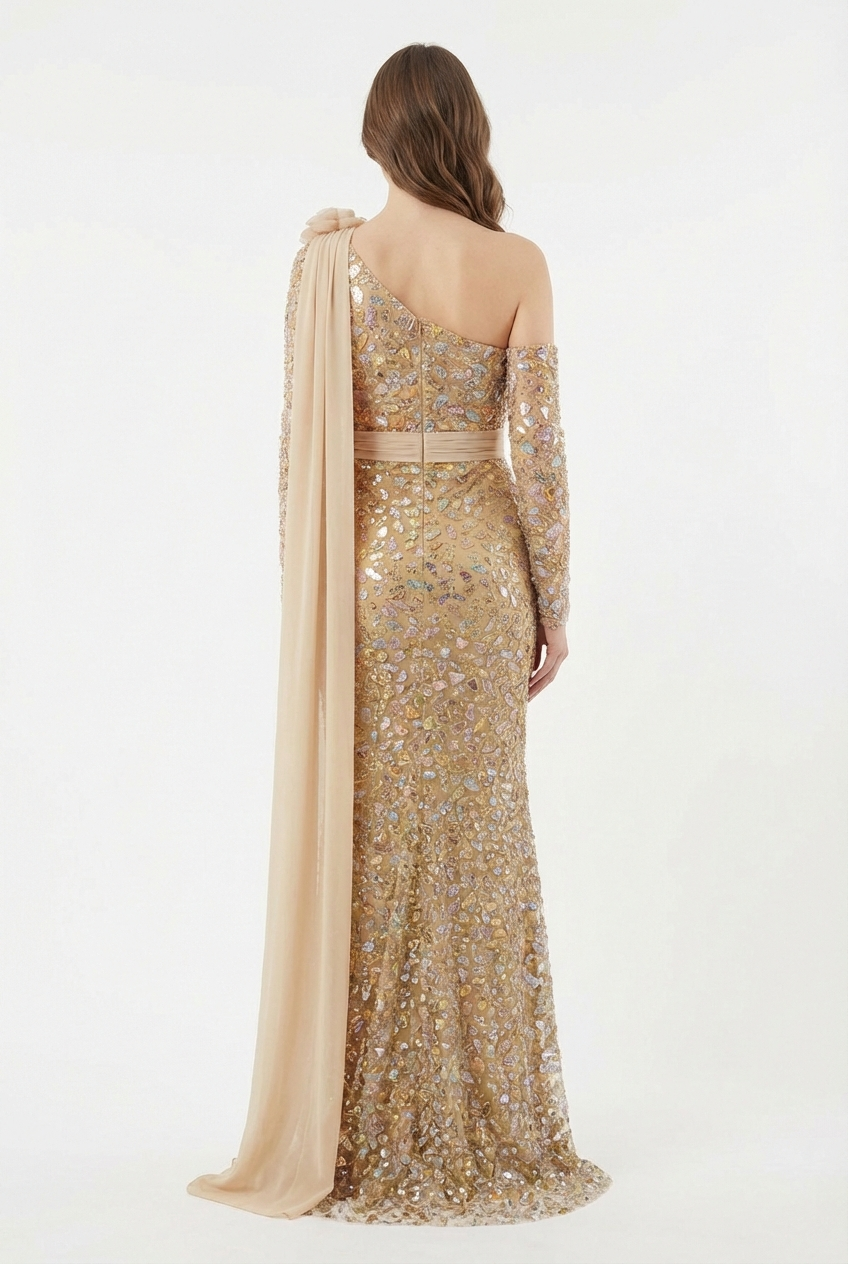 Die lange Ärmelpartie auf einer Seite, die feine Taillenbetonung und der edel fallende Stoff schaffen eine besondere Balance aus Raffinesse und Glamour. Ein exklusives Kleid für große Auftritte, Galaabende und besondere Anlässe, bei denen Eleganz und Individualität im Mittelpunkt stehen.