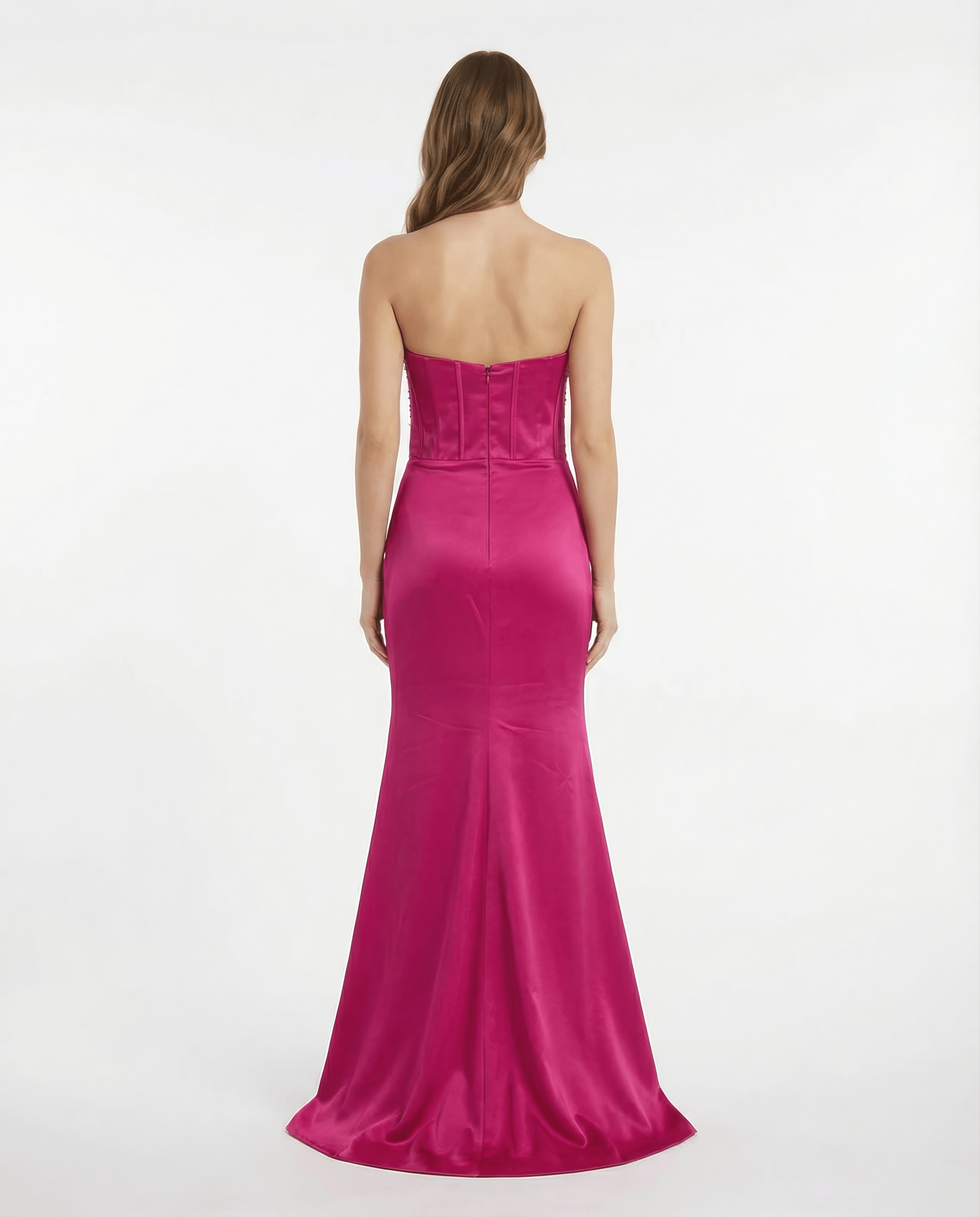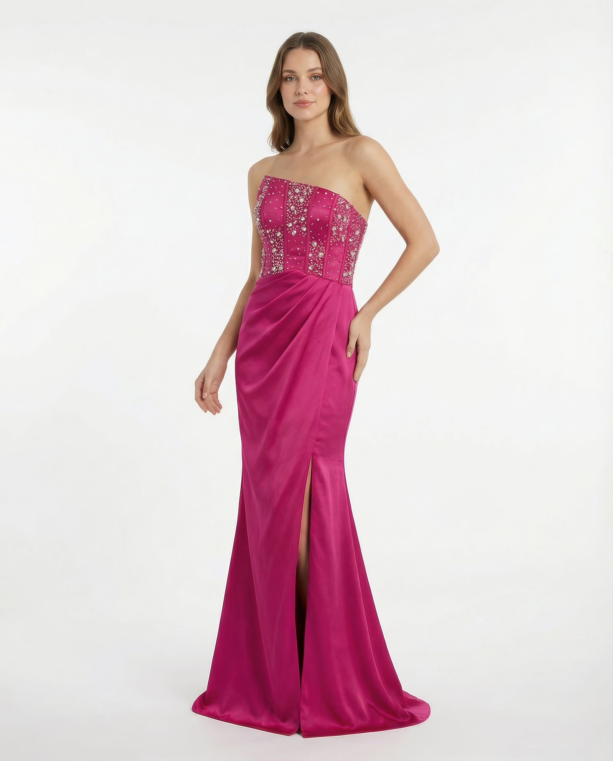 Die sanfte Drapierung an der Taille schmeichelt der Figur, während der hohe Beinschlitz für eine elegante und zugleich moderne Note sorgt. Ein stilvolles Kleid für festliche Abende, Hochzeiten und besondere Anlässe, bei denen ein eleganter Auftritt im Mittelpunkt steht.