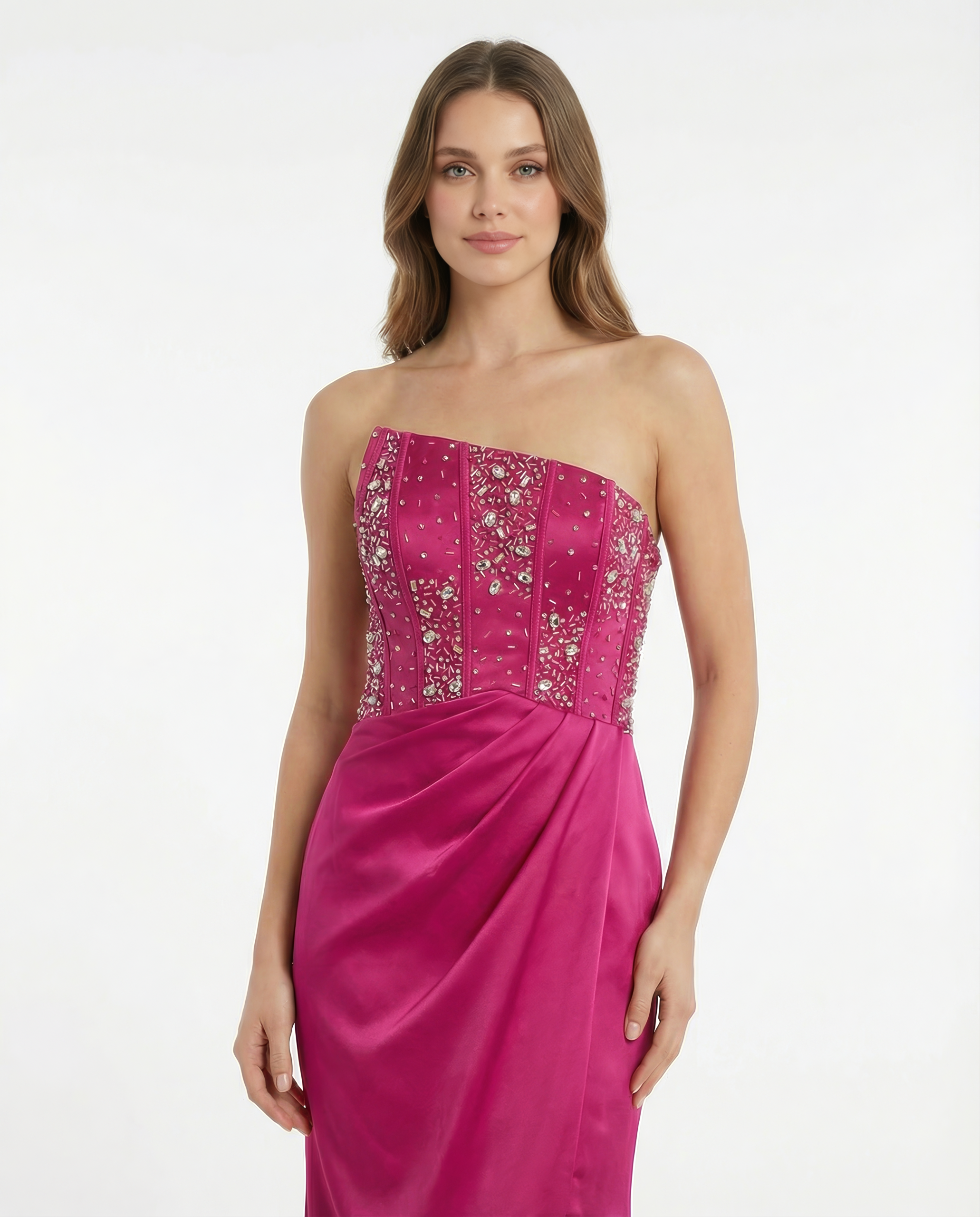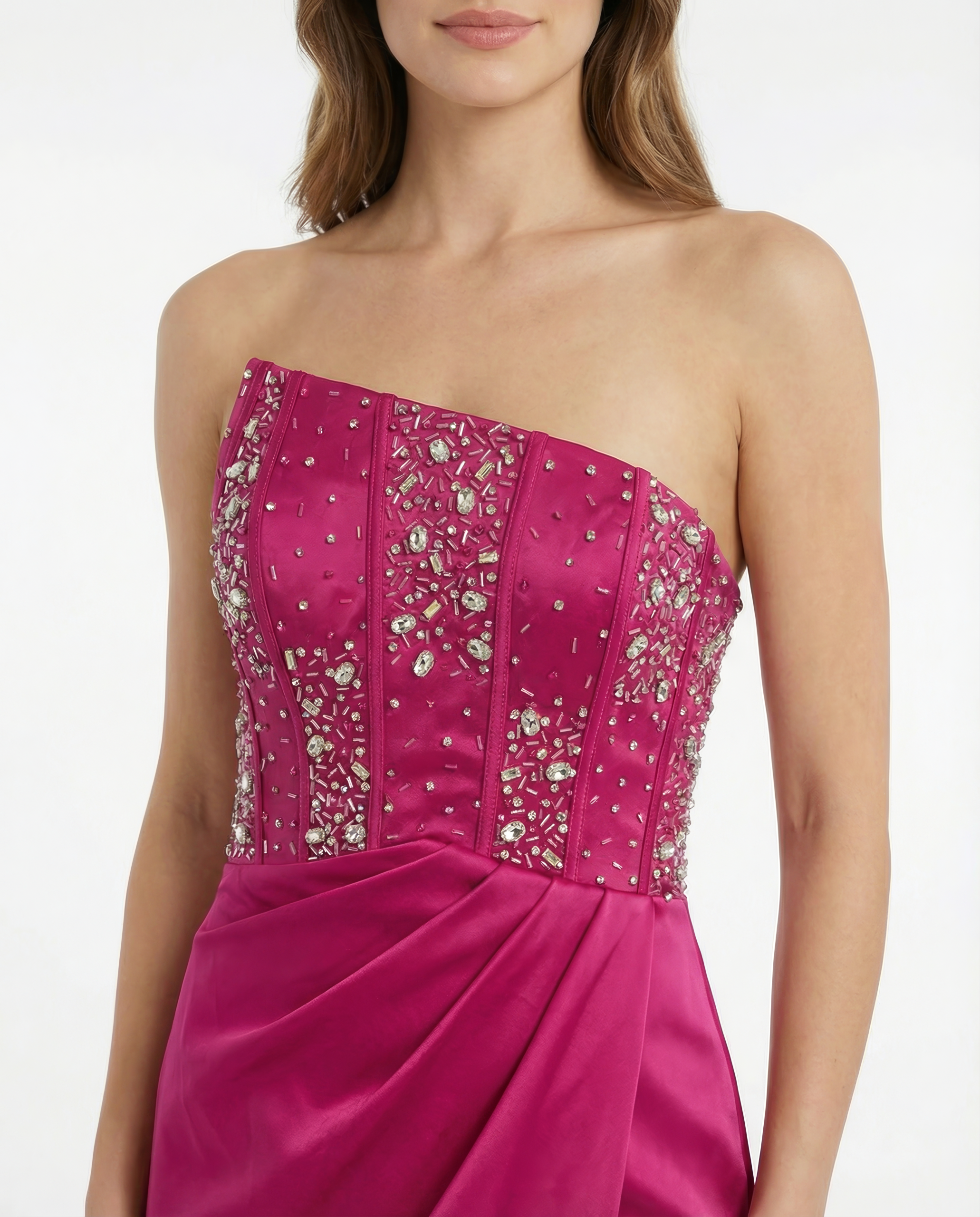 Dieses Abendkleid verbindet moderne Eleganz mit einer ausdrucksstarken, femininen Linie. Das asymmetrische Oberteil mit funkelnden Verzierungen setzt das Dekolleté stilvoll in Szene und verleiht dem Look eine besondere, edle Ausstrahlung.